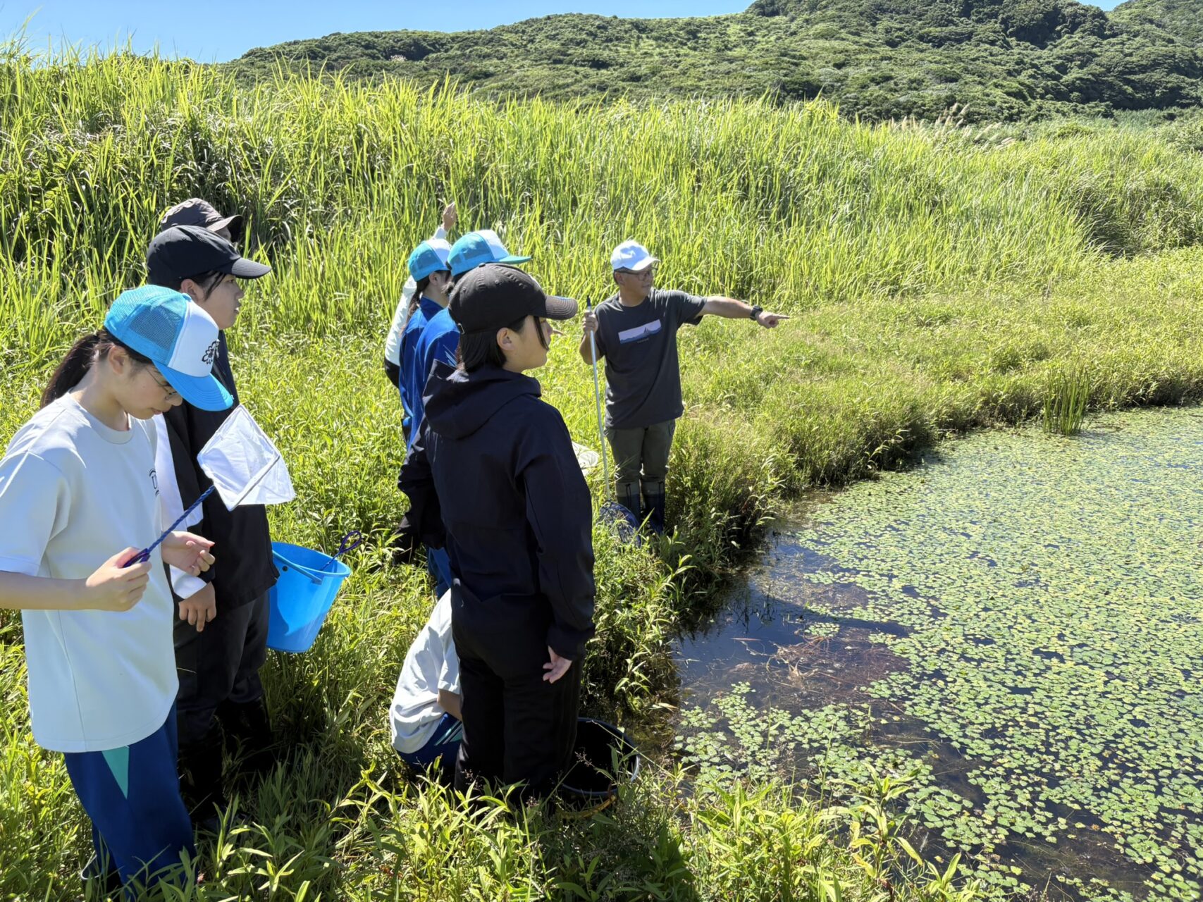 その後、実際に野外に出て、島内3カ所で、水生生物や植物などを採取し、中原さんから、詳しい説明を受けました。